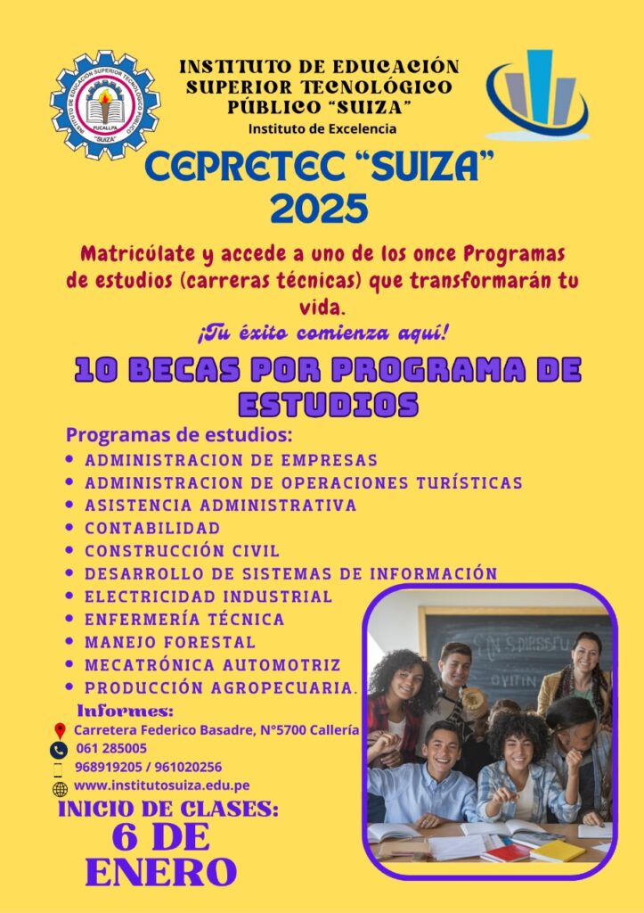 INSTITUTO DE EXCELENCIA El I.E.S.T.P. Suiza con la Dirección Regional de Trabajo de Ucayali, con la finalidad de brindar a los estudiantes de los 11 programas de estudios, capacitaciones en diversos temas como la conformación y gestión empresarial, contrataciones con el estado y otros. https://iestpsuiza.edu.pe/wp-content/uploads/2024/03/2-TRABAJO-SUIZA.mp4